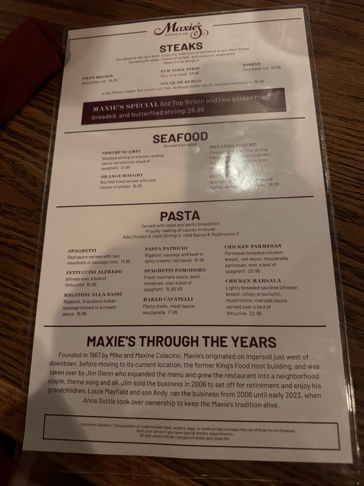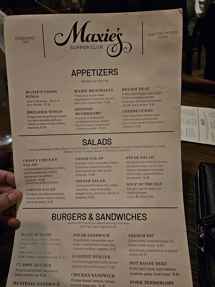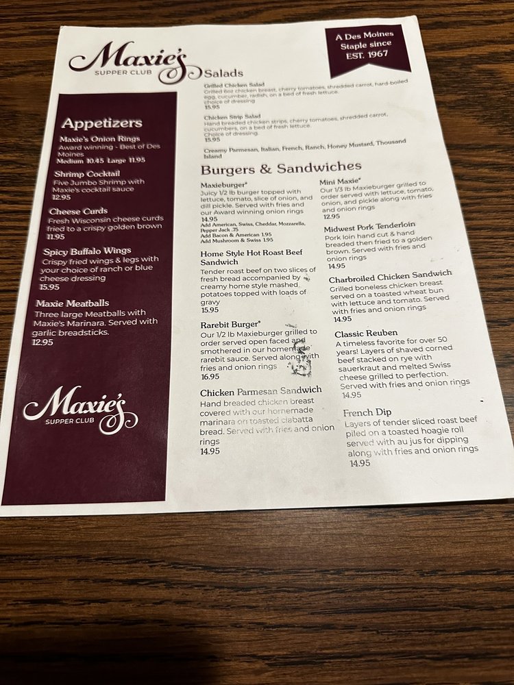 Maxie's Restaurant & Lounge in West Des Moines, IA offers a classic American dining experience with a supper club vibe. Known for its tasty Maxie burger, onion rings, prime rib, and shrimp dishes, this establishment has been a staple for many families and visitors. The atmosphere remains unchanged and nostalgic, creating a unique dining experience. Customers also rave about the delicious spaghetti Pomodoro and the phenomenal strawberry shortcake. The menu offers a variety of options, although some discrepancies may exist between online listings and in-house selections. With quick and friendly service, reasonable pricing, and a cozy yet clean interior, Maxie's is a great choice for gatherings with loved ones or a blast from the past. Don't forget to save room for their irresistible desserts!